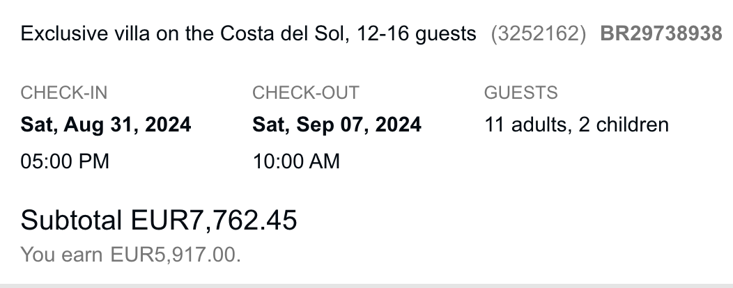 As can be seen, the guest is asked to pay upfront 7,762.45 euros for the week, 10 months ahead of their holiday. I will never see the first Euro of this money until mid-September 2024...